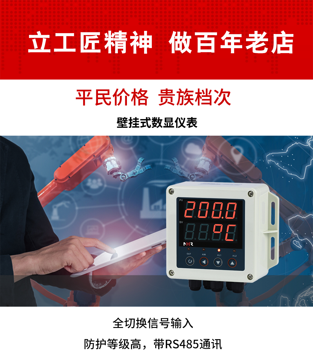 虹潤(rùn)公司是專業(yè)生產(chǎn)數(shù)顯表的國(guó)家專精特新“小巨人”企業(yè),生產(chǎn)的壁掛式數(shù)顯儀表,具有全切換信號(hào)輸入,高抗干擾,IP65防護(hù)等級(jí),全隔離設(shè)計(jì),變送輸出或RS485通訊等特點(diǎn)。產(chǎn)品獲得巡回檢測(cè)顯示方法及裝置、工業(yè)模塊的導(dǎo)軌式安裝結(jié)構(gòu)等2項(xiàng)國(guó)家發(fā)明專利,主持起草工業(yè)過(guò)程控制系統(tǒng)用模擬輸入兩位或多位輸出儀表、物聯(lián)網(wǎng)智能溫度儀表通用技術(shù)條件等2項(xiàng)國(guó)家標(biāo)準(zhǔn),,以及通信系統(tǒng)多通道數(shù)據(jù)采集控制終端規(guī)范軍用標(biāo)準(zhǔn),參與國(guó)際5G標(biāo)準(zhǔn)制定,取得簡(jiǎn)易數(shù)顯儀表等3項(xiàng)相關(guān)軟件著作權(quán)。產(chǎn)品廣泛應(yīng)用于電力、石化、冶金、化工、造紙、食品、輕工、制藥、熱處理、水處理、機(jī)械配套等各種工業(yè)現(xiàn)場(chǎng)。