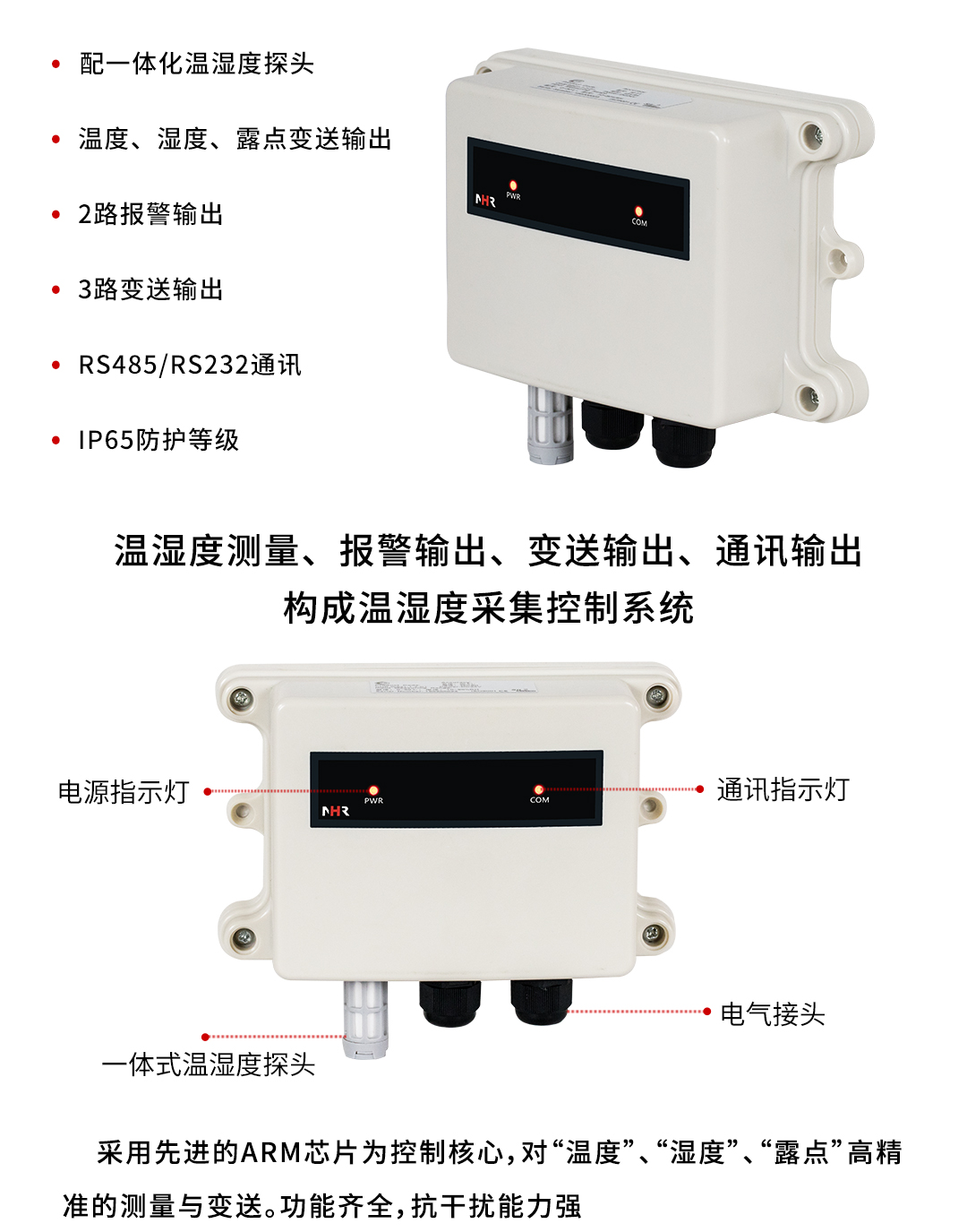 虹潤公司是專業(yè)生產(chǎn)環(huán)境監(jiān)測儀表的國家專精特新“小巨人”企業(yè)。生產(chǎn)的一體式溫濕度變送器,具有溫度、濕度、露點(diǎn)高精準(zhǔn)的測量與變送,報警繼電器輸出,RS485/RS232通訊,IP65防護(hù)等級等特點(diǎn)。產(chǎn)品獲得一種手持式低功耗溫濕度檢測儀、大屏幕溫濕度記錄儀等2項(xiàng)國家發(fā)明專利,主持起草物聯(lián)網(wǎng)智能溫度儀表通用技術(shù)條件、冷鏈溫度記錄儀等2項(xiàng)國家標(biāo)準(zhǔn),以及通信系統(tǒng)多通道數(shù)據(jù)采集控制終端規(guī)范軍用標(biāo)準(zhǔn),以及現(xiàn)場設(shè)備集成等5項(xiàng)智能制造國家標(biāo)準(zhǔn),參與國際5G標(biāo)準(zhǔn)制定,取得溫濕度儀表等3項(xiàng)相關(guān)軟件著作權(quán)。產(chǎn)品廣泛應(yīng)用于工業(yè)現(xiàn)場、農(nóng)業(yè)大棚、倉儲物流、地下管廊、養(yǎng)殖孵化、配電機(jī)房等諸多領(lǐng)域。