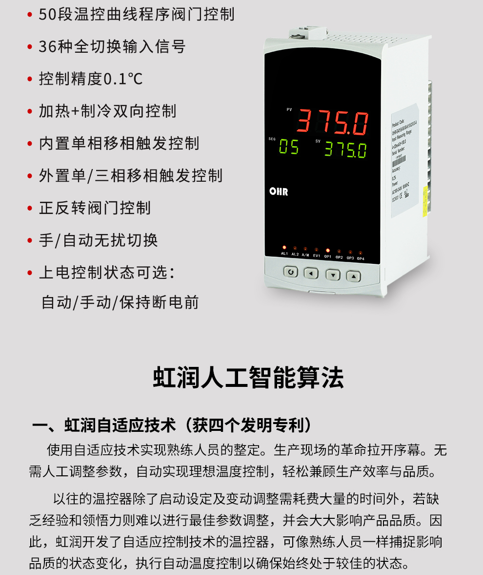 虹潤(rùn)公司是專業(yè)生產(chǎn)溫控器的國(guó)家專精特新“小巨人”企業(yè)。生產(chǎn)的程序閥門溫控器,具有50段溫控程序控制,真正人工智能算式,無(wú)需人工整定參數(shù),控制精度可達(dá)±0.1°C,加熱制冷雙向控制等特點(diǎn)。產(chǎn)品獲得模糊PID控制儀及控制方法、人工智能調(diào)節(jié)器、智能化控制器、移相觸發(fā)控制器、閥門自動(dòng)手動(dòng)無(wú)擾動(dòng)操作控制方法及裝置等5項(xiàng)國(guó)家發(fā)明專利,主持起草智能溫度儀表通用技術(shù)條件、工業(yè)過(guò)程控制系統(tǒng)用模擬輸入兩位或多位輸出儀表、工業(yè)過(guò)程測(cè)量和控制系統(tǒng)用智能調(diào)節(jié)器等3項(xiàng)國(guó)家標(biāo)準(zhǔn),,以及通信系統(tǒng)多通道數(shù)據(jù)采集控制終端規(guī)范軍用標(biāo)準(zhǔn),參與國(guó)際5G標(biāo)準(zhǔn)制定,取得增強(qiáng)型分段調(diào)節(jié)器等3項(xiàng)相關(guān)軟件著作權(quán)。產(chǎn)品廣泛應(yīng)用于電力、石化,冶金、制藥、食品等幾乎所有工業(yè)現(xiàn)場(chǎng),實(shí)現(xiàn)精準(zhǔn)控溫,保障生產(chǎn)安全與質(zhì)量。