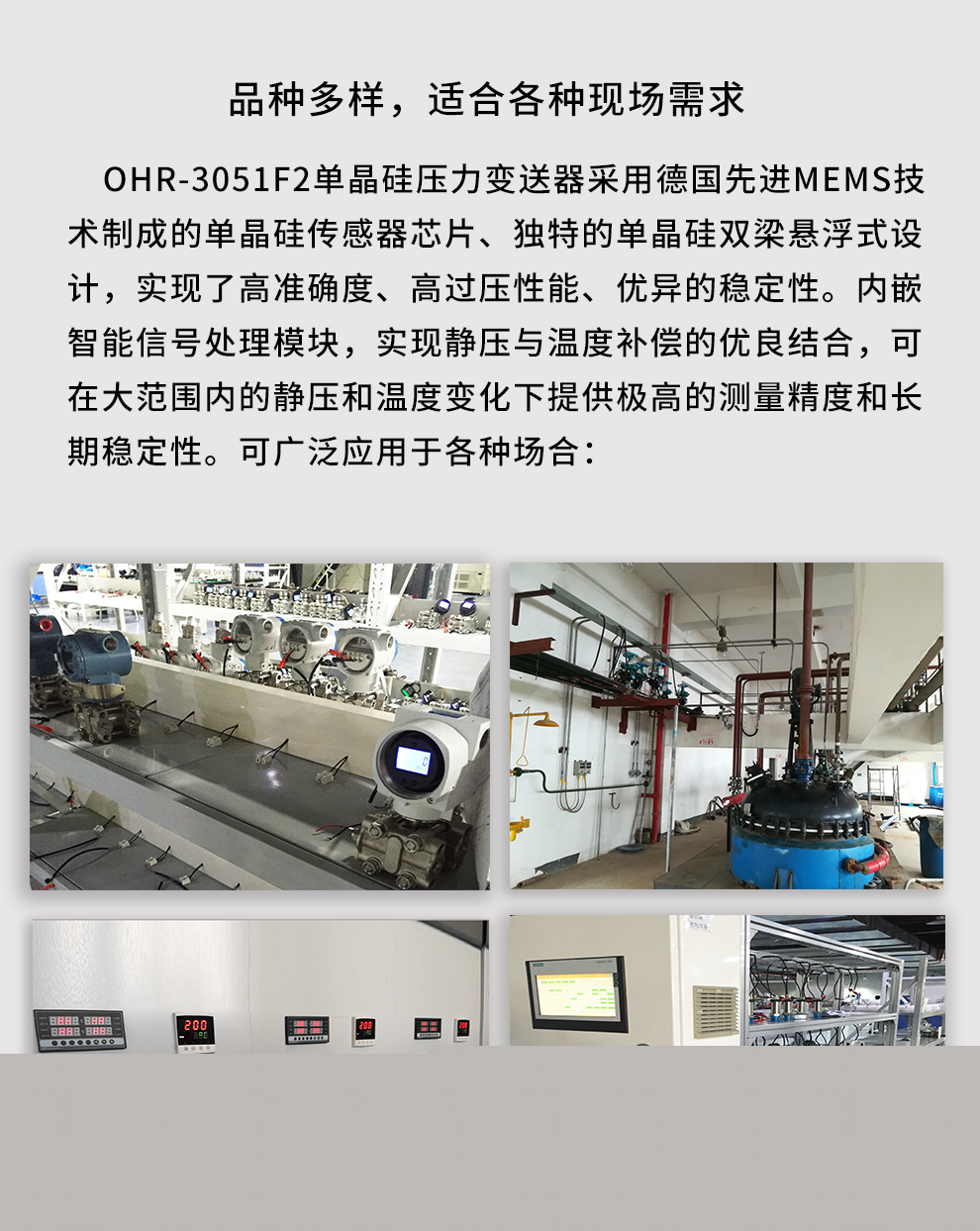 虹潤公司是專業(yè)生產(chǎn)壓力變送器的國家專精特新“小巨人”企業(yè),生產(chǎn)的單晶硅壓力變送器,具有高精度,小溫漂,性能穩(wěn)定,帶HART通訊,抗干擾能力強(qiáng),自診斷功能等特點(diǎn)。產(chǎn)品獲得一種數(shù)字顯示低功耗壓力表、一種信號(hào)發(fā)生器裝置等2項(xiàng)國家發(fā)明專利,主持起草工業(yè)過程控制系統(tǒng)用模擬輸入兩位或多位輸出儀表、工業(yè)過程測量和控制系統(tǒng)用壓力/差壓變送器等2項(xiàng)國家標(biāo)準(zhǔn),通信系統(tǒng)多通道數(shù)據(jù)采集控制終端規(guī)范軍用標(biāo)準(zhǔn),以及現(xiàn)場設(shè)備集成等5項(xiàng)智能制造國家標(biāo)準(zhǔn)。參與國際5G標(biāo)準(zhǔn)制定,取得數(shù)顯壓力表等2項(xiàng)相關(guān)軟件著作權(quán)。產(chǎn)品廣泛應(yīng)用于化工、食品、制藥、電力、設(shè)備配套、供暖、水處理、樓宇等行業(yè),需精準(zhǔn)測量流體壓力的現(xiàn)場。