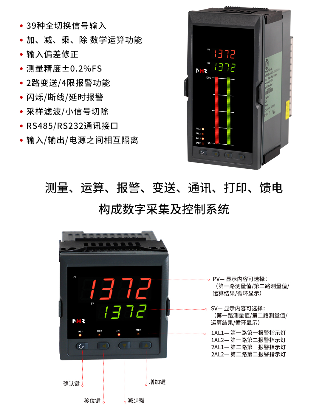 虹潤公司是專業(yè)生產(chǎn)數(shù)顯表的國家專精特新“小巨人”企業(yè),生產(chǎn)的智能雙路數(shù)顯儀表,具有全切換信號輸入,加減乘除數(shù)學運算,高抗干擾,過壓過流保護,RS485/RS232通訊等特點。產(chǎn)品獲得巡回檢測顯示方法及裝置、儀表殼體等2項國家發(fā)明專利,主持起草工業(yè)過程控制系統(tǒng)用模擬輸入兩位或多位輸出儀表、物聯(lián)網(wǎng)智能溫度儀表通用技術(shù)條件等2項國家標準,,以及通信系統(tǒng)多通道數(shù)據(jù)采集控制終端規(guī)范軍用標準,參與國際5G標準制定,取得雙回路數(shù)字顯示控制儀表等3項相關軟件著作權(quán)。產(chǎn)品廣泛應用于電力、石化、冶金、化工、造紙、食品、輕工、制藥、熱處理、水處理、機械配套等各種工業(yè)現(xiàn)場。
