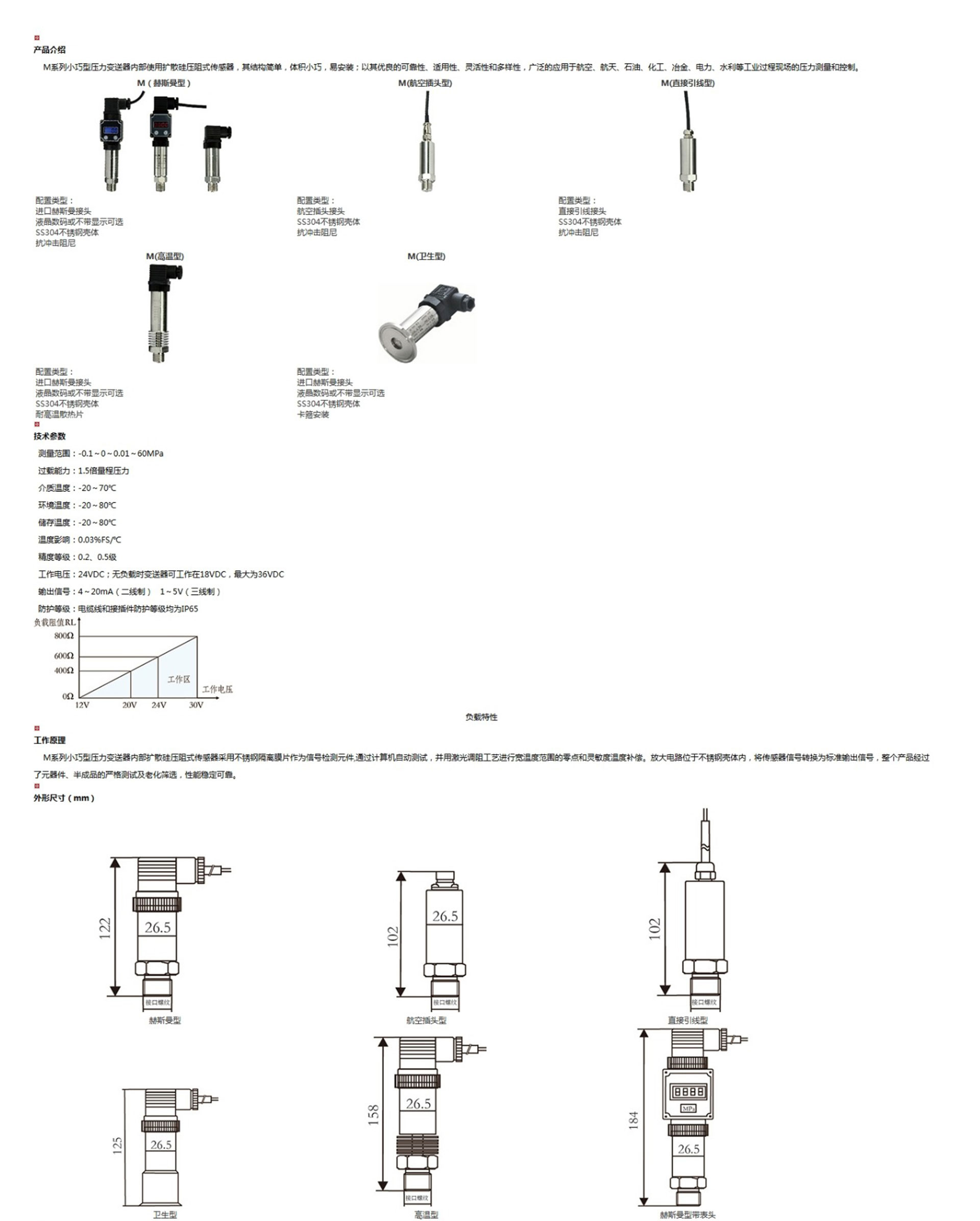 M系列小巧型壓力變送器內(nèi)部使用擴(kuò)散硅壓阻式傳感器,其結(jié)構(gòu)簡單,體積小巧,易安裝;以其優(yōu)良的可靠性、適用性、靈活性和多樣性,廣泛的應(yīng)用于航空、航天、石油、化工、冶金、電力、水利等工業(yè)過程現(xiàn)場的壓力測量和控制。